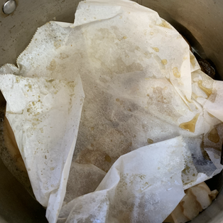 落とし蓋がないときは、このように、パーチメントペーパー(オーブンペーパー)をおきます。
